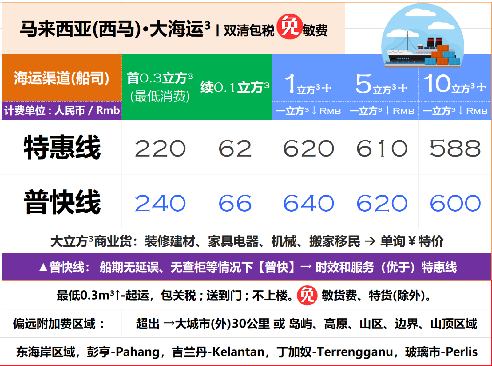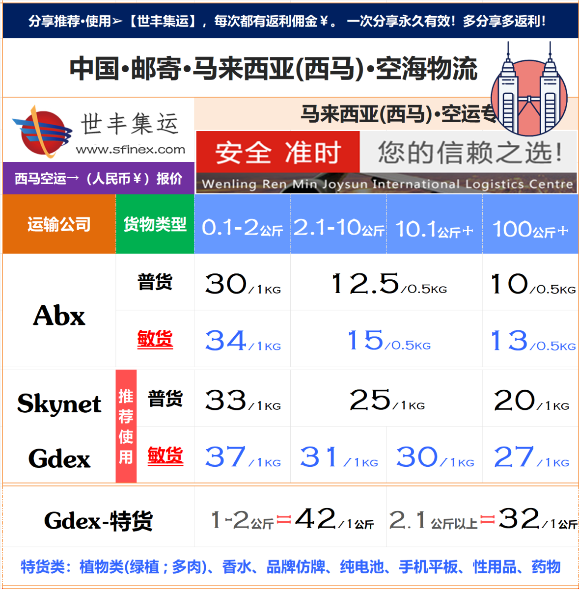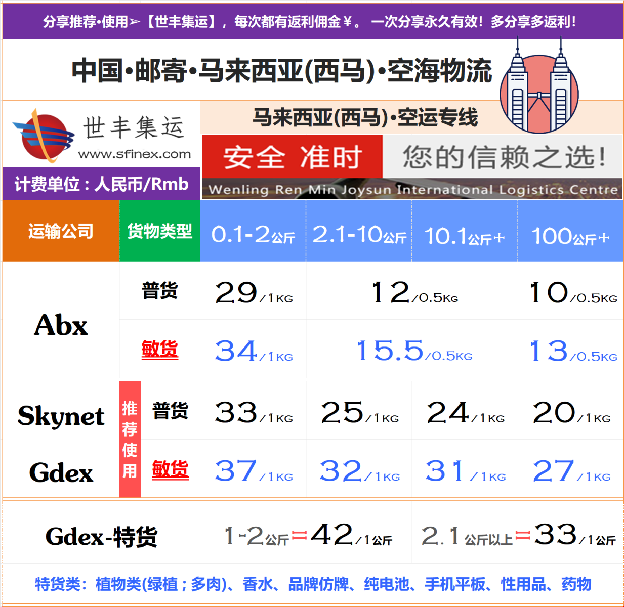 世丰国际代运-马来西亚丨吉隆坡丨雪兰莪(Malaysia集运)→西马空运、海运小包、立方大海运→运输费