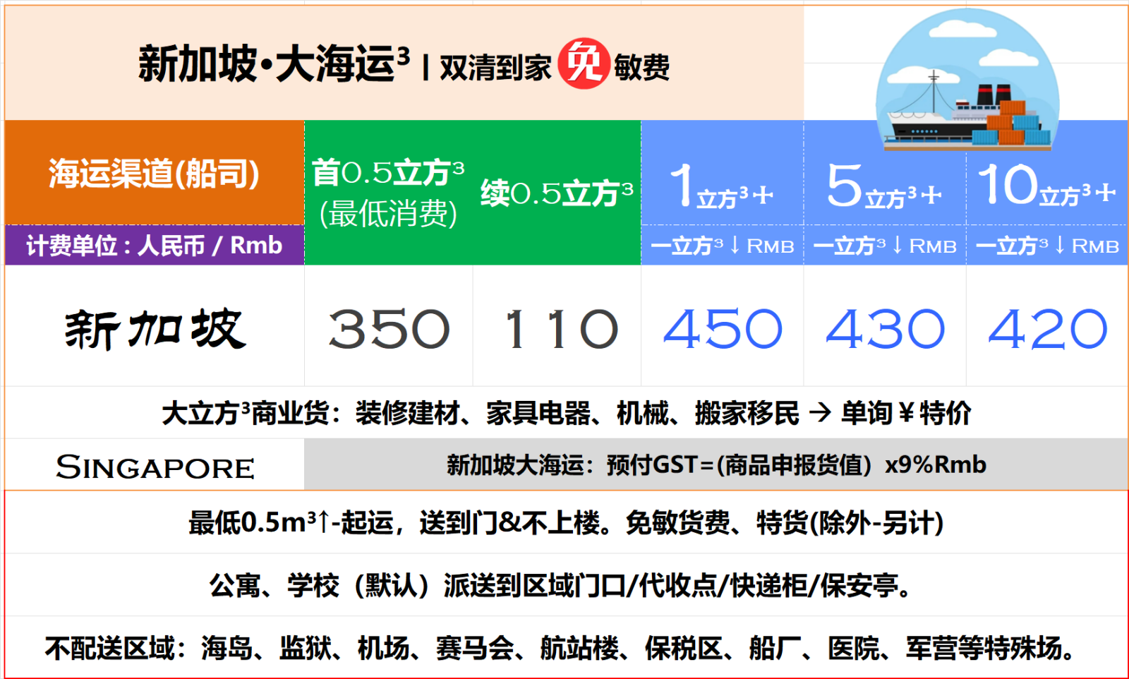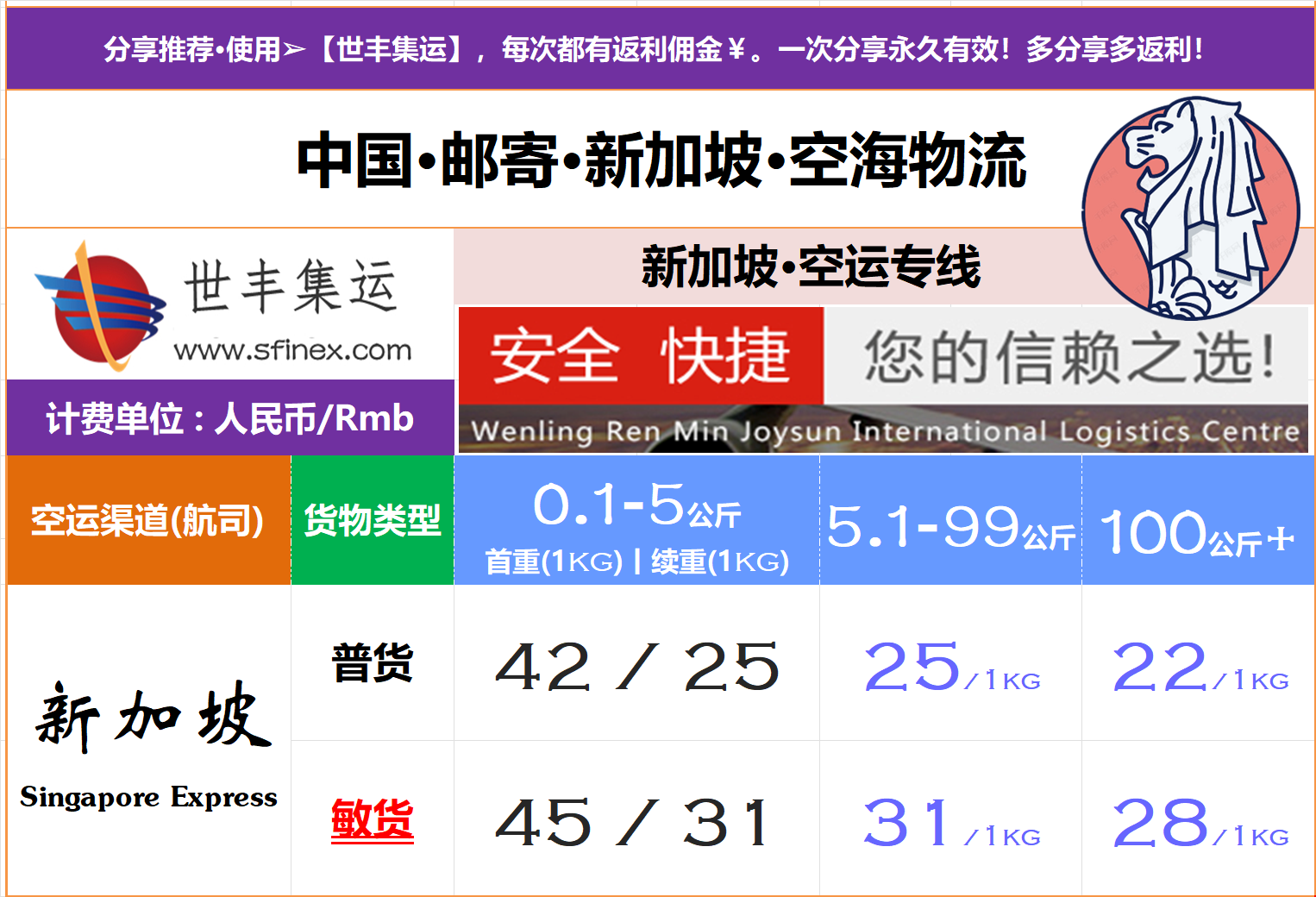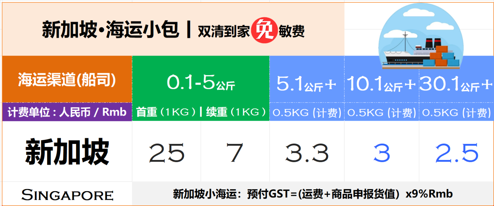 世丰国际代运-中国淘宝-寄送-狮城集运-Singapore-新加坡空运、海运小包、立方大海运→运输费