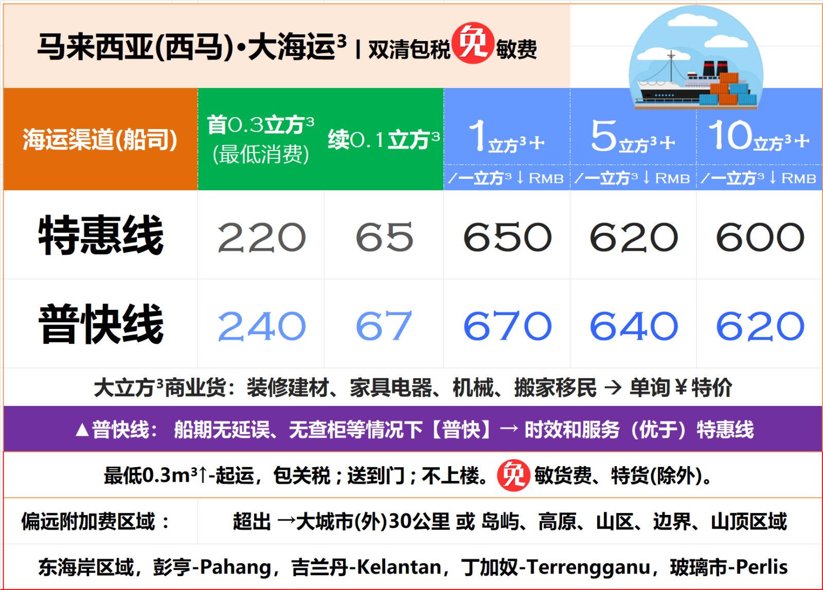 世丰国际代运-马来西亚丨吉隆坡丨雪兰莪(Malaysia集运)→西马空运、海运小包、立方大海运→运输费